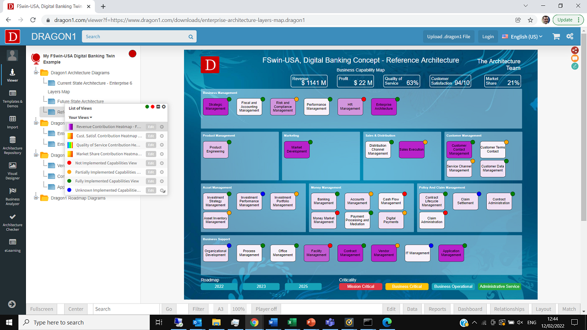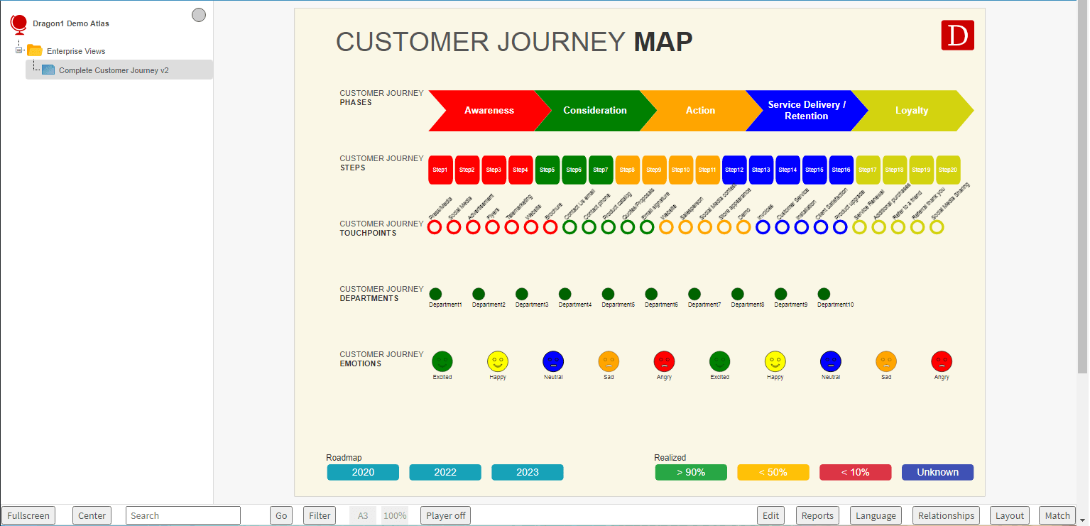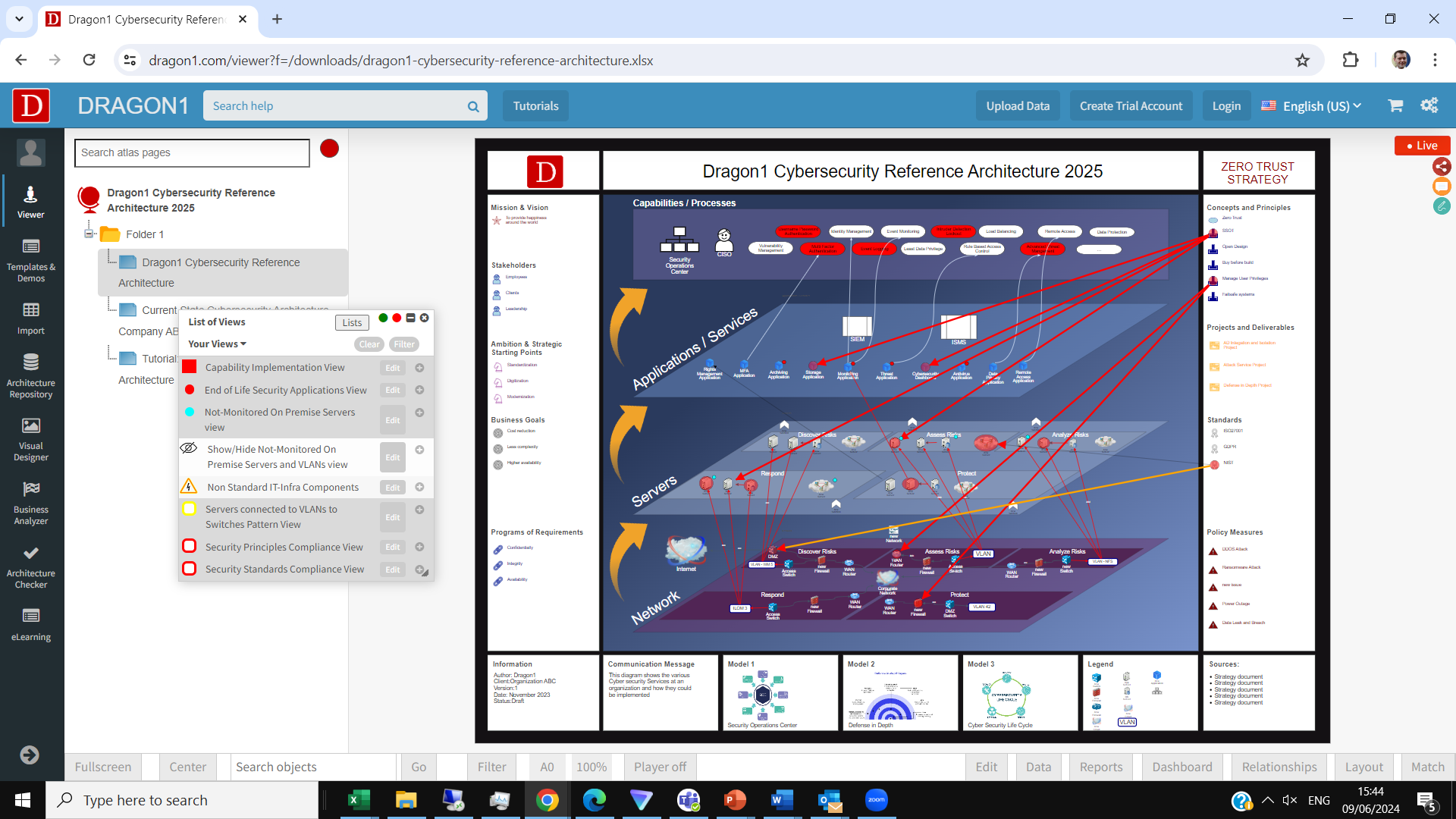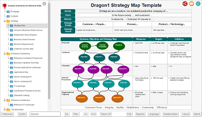 Click on a visualization to see a demo of how an architecture diagram, map, model, or framework is generated from an Excel sheet or .dragon1 file (JSON) populating a Dragon1 template. You can download the .dragon1 file which is below the demos. Provide this with your data and upload it in the Dragon1 Viewer. The Viewer supports you in mapping and filtering data, changing the layout, matching, comparing, and analyzing principles, rules, guidelines, standards, etc. Experience the convenience of the Dragon1 enterprise architecture software platform.