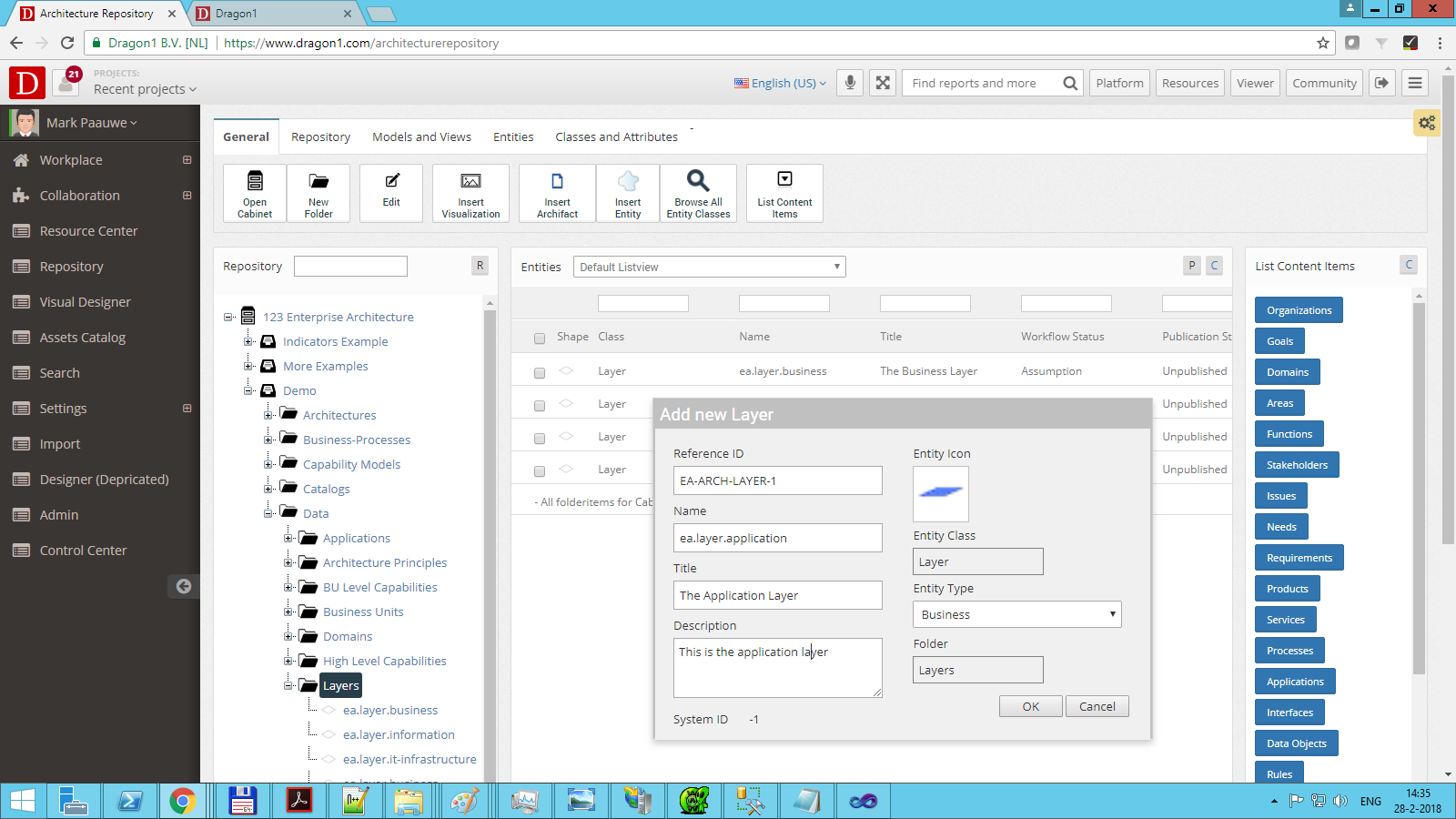 On Dragon1, you can create your architecture layers and collections of architecture layers.
