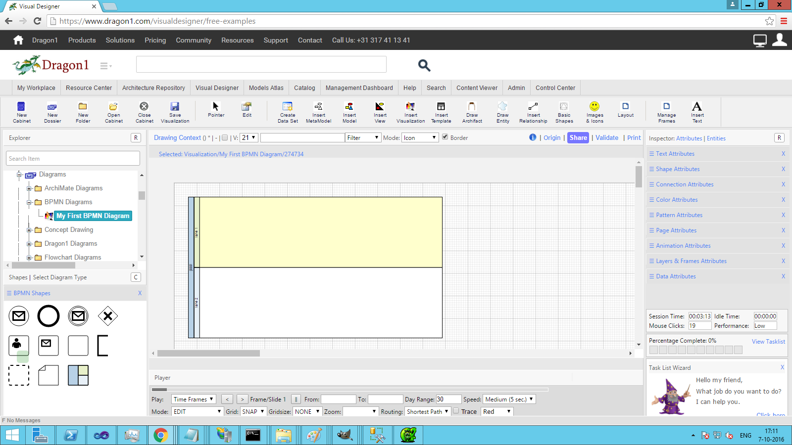 On Dragon1, you can create BPMN diagrams. These diagrams are suitable for modeling business processes. This page is a tutorial for creating a simple BPMN diagram or, in other words, a process model.