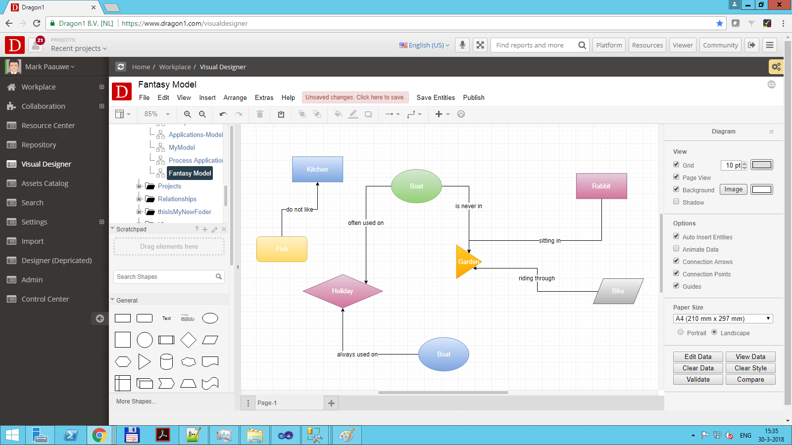 - Draw relationships (links, connections) between entity shapes on a canvas.